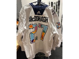 Pride jersey autographed by #27 Ryan McDonagh. (fight strap included). Worn during pre-game skate April 4. SIZE 58.