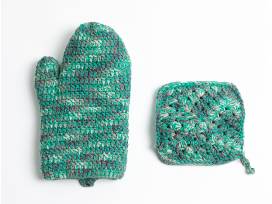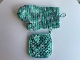 Oven mitt and square shaped potholder set crocheted with blue, gray and white acrylic yarn.
