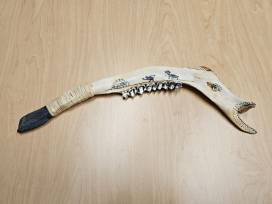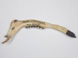 Caribou jawbone with teeth still in it, tipped with a flint stone on the end. Both sides of the jaw are designed and signed by the artist.