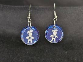 These hook-style earrings feature the cheerful chubby faced Sailor Boy Pilot Bread mascot, a beloved symbol of rural Alaskan soul food, against a blue glitter background embedded in resin.