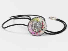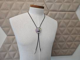A classic western accessory, a metal concho on fish skin backed with moose hide, Montana Blue Crystal with miscellaneous beads, hanging from a leather cord finished with nickel plated tips.