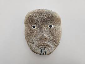 A whalebone mask with ivory eyes signed and dated by artist Laurie Kingik, a famous Point Hope hunter.
