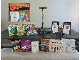 This has everything you might need to keep your kids busy this summer, including these games: Concept, Lucky Numbers, Just One, Phil Walker-Harding Barenpark, Escape the 80's Escape Room, Mind the Gap Trivia Game for the Generations, Rhino Hero Super Battle 3D Card Stacking Game, Rainbow Go! Trivia Game, Second Thoughts Quick Thinking vs. Fast Talking Party Game, Road Trip Packing Puzzle, and Micro Maxi Scooter; all from Imagine That Toys. Enjoy a new Ukulele with Instruction book and lesson gift card from Garten's Music. In addition, have some fun with two $35 gift cards to Dave & Busters, two 1-month youth program certificates from YMCA, a $20 gift card to The Arcade, a $25 gift certificate and food coupons to Headshots Arcade Bar & Grill, and four 1-hour jump passes to Sports Forum.