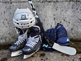CCM gloves (size 14.0"), helmet, and left-handed stick & Bauer skates (no blades) with "#29 Dunn" on the tongue, all used and signed by #29 Vince Dunn.