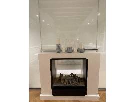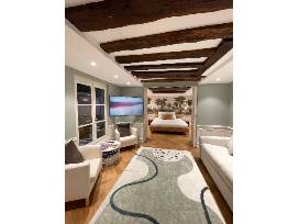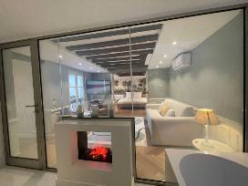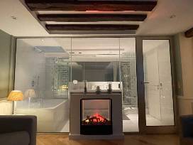 - It has both air-conditioning for the summer and heated floors for the winter, and in door fireplace which can be enjoyed both from the bedroom and reclining in the bath.