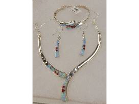 This unique necklace, earring and cuff jewelery set is to be handcrafted by a Native American artisan. All stones have been hand-set in Sterling Silver. Settings of turquoise and stabilized turquoise are guaranteed to be genuine.