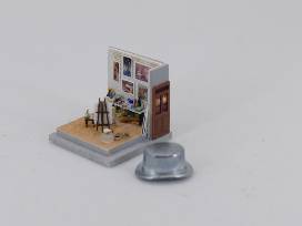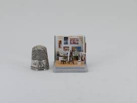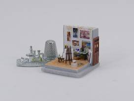 Take home this miniature imaginary art studio filled with art works from the Florence Griswold Museum's historic boardinghouse. Measures 1 inch tall and created by miniature artist Fran Sussman. Monopoly pieces not included but added to show scale.