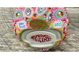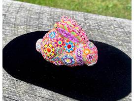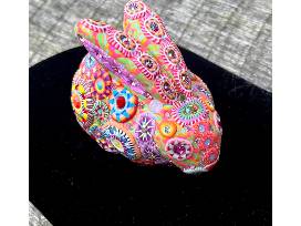 One-of-a-kind, polymer clay and Swarovski crystal bunny bank. Made in the ancient technique of millefiore and Venetian glass, 3.25 inches tall. Handmade by Robert Nielsen and Billie Tannen of Billie Beads, 2023.