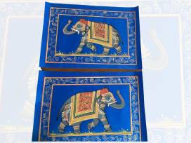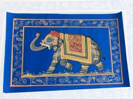 This painting on raw silk cloth is a traditional Pichwai art form from the Northwestern Indian state of Rajasthan. Natural dyes are used in this painting depicting an elephant "dressed-up" with decorations on a royal blue silk with red and gold border. Each measures approximately 9.5"x13"