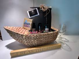 - Package includes: 3 bottles of Cape May Winery wines, I decorative boat basket, 1 gift certificate to Cape May Winery, cocktail napkins, 2 etched octopus wine glasses, and a decorative wooden sign.