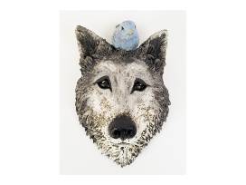 Deb McCunn; Wolf With Bird; ceramic; 5'' x 8'' x 4''