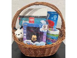 - Basket with Mr. Pop game, 100 page activity set, Disney Mickey Motion Sensor Mini Helicopter, Orb toys, and stuffed animal keychain