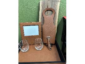118x8 black walnut charcuterie board, serving tray, wine opener, wine holder, 2-15 oz. wine stemless glasses, picture frame from Tyler Trophy.