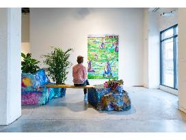 10In TIMESHARE, Mayer explores how art can function and/or aid during times of disaster or even when the planet becomes uninhabitable. Her work uses the formula of part solutionism part subtle denial mixed with an "everything will be fine" attitude. While the problem might actually be too large to be addressed in any actual sense, the works in this show attempt, with humor and insight. For example, A Sculpture Can Be Used As A Flotation Device In Times Of Emergency is a text work that greets the viewers, and sets the stage for the exhibition. Upon entering further, the viewer will be transported into a contemporary conservatory, an indoor/outdoor sculpture park of sorts, complete with fountains, architectural resting zones, and greenery. Through a variety of mediums that include video, painting, and sculptural objects, Mayer's environment can act as a place that offers refuge and solace while also serving as a blueprint for garden designers of the future. TIMESHARE investigates and comments on both art's objective and the artist's responsibility.
