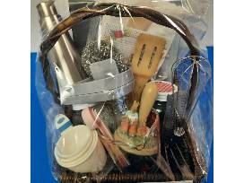 If you're into retro items you will love this basket! It is filled with kitchen items from the past such as measuring cups & spoons, soap holder, canning jars and a set of glassware bowls for cooking and baking. All in mint condition too!