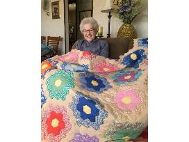 - Note from Zion Lutheran: "This vintage quilt was donated by Bea Tews. The flowers are made from left over material from dresses that were made for Bea and her sister, Eleanor, dating back to the 1940s during World War II. The quilt top was made by Bea's mother, Lydia Michaelis, and was given to Bea as a young bride. Later on, she and some friends and relatives got together and quilted it."