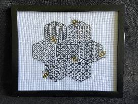 - Details: 10" x 8" framed blackwork embroidery piece with bees and honeycomb