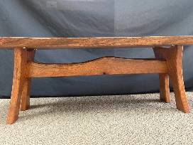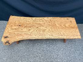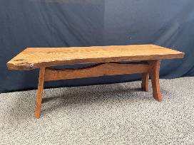 - Details: handmade oak table with live edge, measuring 46.5" long, 17" tall and 21" wide. Could also be used as a bench!