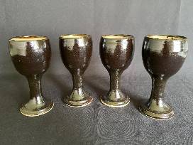 - Details: 4 goblets, measuring 7" tall and 3.5" wide, with a dark brown glaze. Made by Bill Gossman, New London.