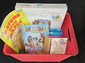 - Details: basket including Concept Kids Animals, Nature Trivia & Mazes book, Dog Crimes, Over Under Ostrich, Goat Yoga and WordSpiel