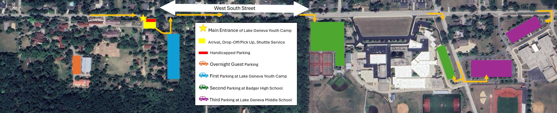 Complimentary shuttles will continuously transport guests from these alternative parking areas to the Lake Geneva Youth Camp's Chapel parking lot.