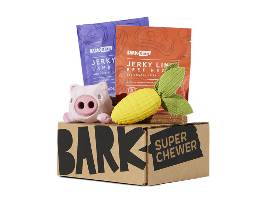 Your dog will give two paws up for the this gift certificate for a Free Month of Super Chewer from BarkBox., customized to your pup! Their gift box will include 2 fun toys, 2 bags of natural treats and 2 tasty chews.
