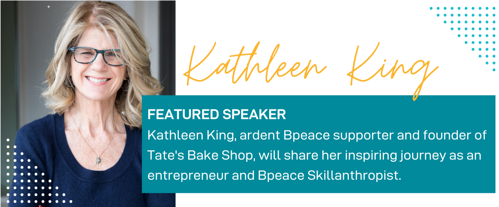 7:45 - 9:00 PM Program including Kathleen King, founder of Tate's Bake Shop, Conversations with Fast Runners and Skillanthropists, Live Auction and performance by Emilie Kouatchou.