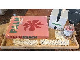 Enjoy this wood and wicker tracy, LAFCO New York Jungle Bloom Candle, glass cloche matches, Assouline Palm Beach coffee table book and decorative shell tassel.