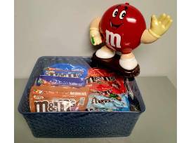 Enjoy this vintage M & M candy dispenser with a variety of candies.