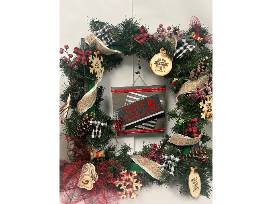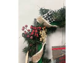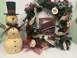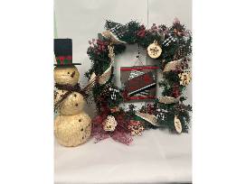 Ring in the holiday spirit with this Christmas duo! Includes a 2 foot square Christmas wreath, bedazzled in ornaments and a 22 inch tall rustic snowman.