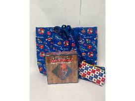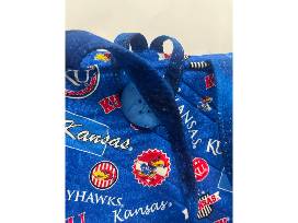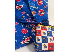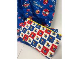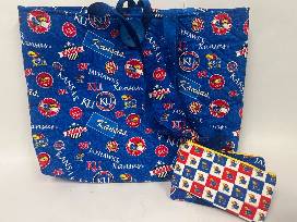 This large handmade quilted tote was created for the KU lover by local quilter, Brenda Dageford. Comes with two 8 inch zippered pouches so you're carrying set can match! Also included is a KU game donated by Carolyn Bloom.