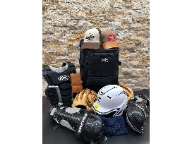 Gear up! This package includes chest guard, leg guards, helmet, box of baseballs, 2 gloves, hat, and travel baseball bag with wheels.