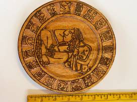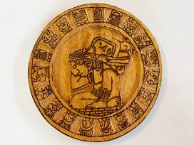 This hand-carved wooden calendar replica is from a Mayan Hieroglyphic found in Copan, Honduras.
