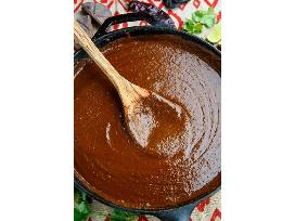 Mole is a Mexican dish from Oaxaca. The sauce is made with many different sorts of chiles, spices, nuts, seeds, herbs, and chocolate and it covers the pieces of chicken. It is just a bit sweet and a bit spicy.