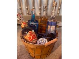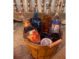 The basket includes one 750ml bottle each of Bluecoat American Dry Gin, Bluecoat Barrel Finished Gin, The Bay Seasoned Vodka, and Penn1681 Vodka, as well as some branded merch and two tour tickets.