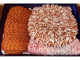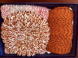Looking for a cozy and stylish gift for yourself or a loved one? Check out this homemade knitted scarf set. It includes three pieces of hand knitted accessories: a regular scarf with a beautiful feather and fan pattern, a ball hat to keep your head warm, and an infinity scarf with a simple garter stitch.