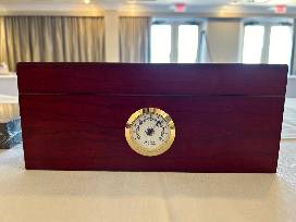 Spanish cedar lined humidor with glass top, analog hygrometer and humidification bar and bottle of fluid. Can hold 40 cigars.