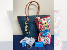 - Isabel Harvey gift basket with a straw beach tote, crystal earrings, crystal bracelet, and beach towel bag