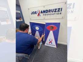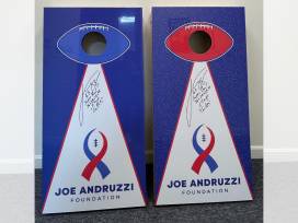 Custom JAF Branded Premium Cornhole Boards with red, white, blue, and football detailing signed by Joe Andruzzi!