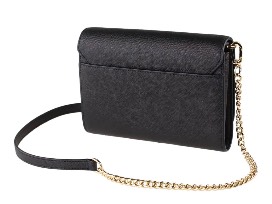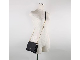 - Two open compartments with 8 credit card slots and slip pocket. -One zip compartment -Gold-tone hardware -Slip pocket on back -Fully lined -Removable chain/leather shoulder strap with approx. 22" drop