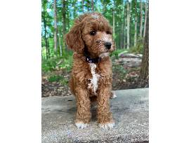 Medium red and white male Goldendoodle due on 11/23/23. Weight range 35-45 pounds full grown. Ready for pick up on January 23. Up to date on shots and worming. Crate trained and sleeping all night.