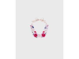 Adorn yourself with a blush pink satin collar bedazzled with pink, blush, and navy beads and stones, creating abstract floral motifs, bringing a touch of refinement to your silhouette. The collar is fastened in the back with a satin ribbon.