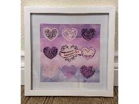 This glass framed 8x8 paper and stamp art piece by Terri Geluso is sure to bring you joy with its soft pinks and purples highlighting nine unique hearts, made for you.