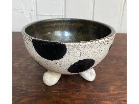 Handcrafted in San Francisco by Loraine Koury, this pair of footed bowls features one with with small dots and stripes and the other with large dots. Both measure 5 1/2" wide x 3 1/4" tall.