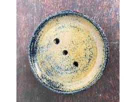 Handcrafted in San Francisco by Loraine Koury, these footed soap dishes will add a touch of flare to your home decor. Both are made from red clay, one having been glazed with a mustard and blue glaze, and the other with a beautiful blue glaze. Both measure 5 1/2" wide x 1 1/4" tall.