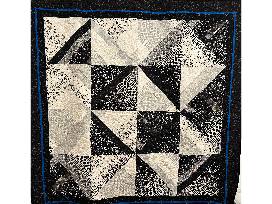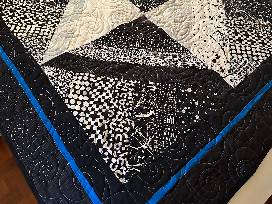 64" x 64" black and white with small blue border, made by Sandy Klein (Flying Dog Quilts).