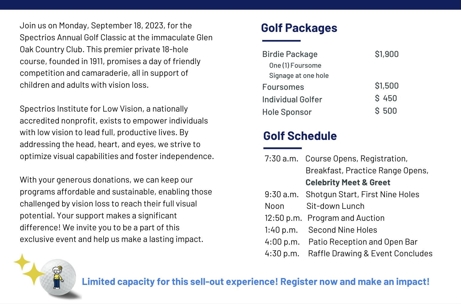 All funds raised go towards the Spectrios Institute for Low Vision's mission to empower children and adults with vision loss, regardless of income, to optimize their capabilities and independence.