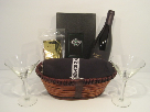 Manny's Steakhouse basket including a $100 gift certificate to Manny's, Manny's steak knives, martini glasses, a bottle of highly rated 2012 Overlook Pinot Noir, and chocolate almonds