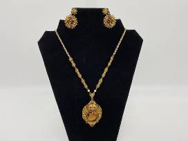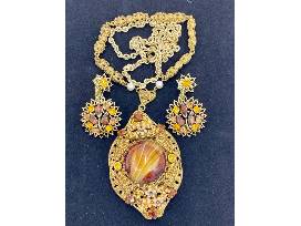 Filigree brand jewelry set with a ornamental charmed necklace and a pair of matching dangle drop clip earrings.