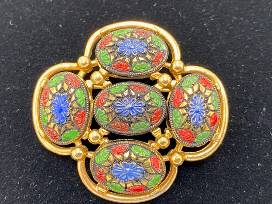 - Design: black cabochon with red, green and blue flowers